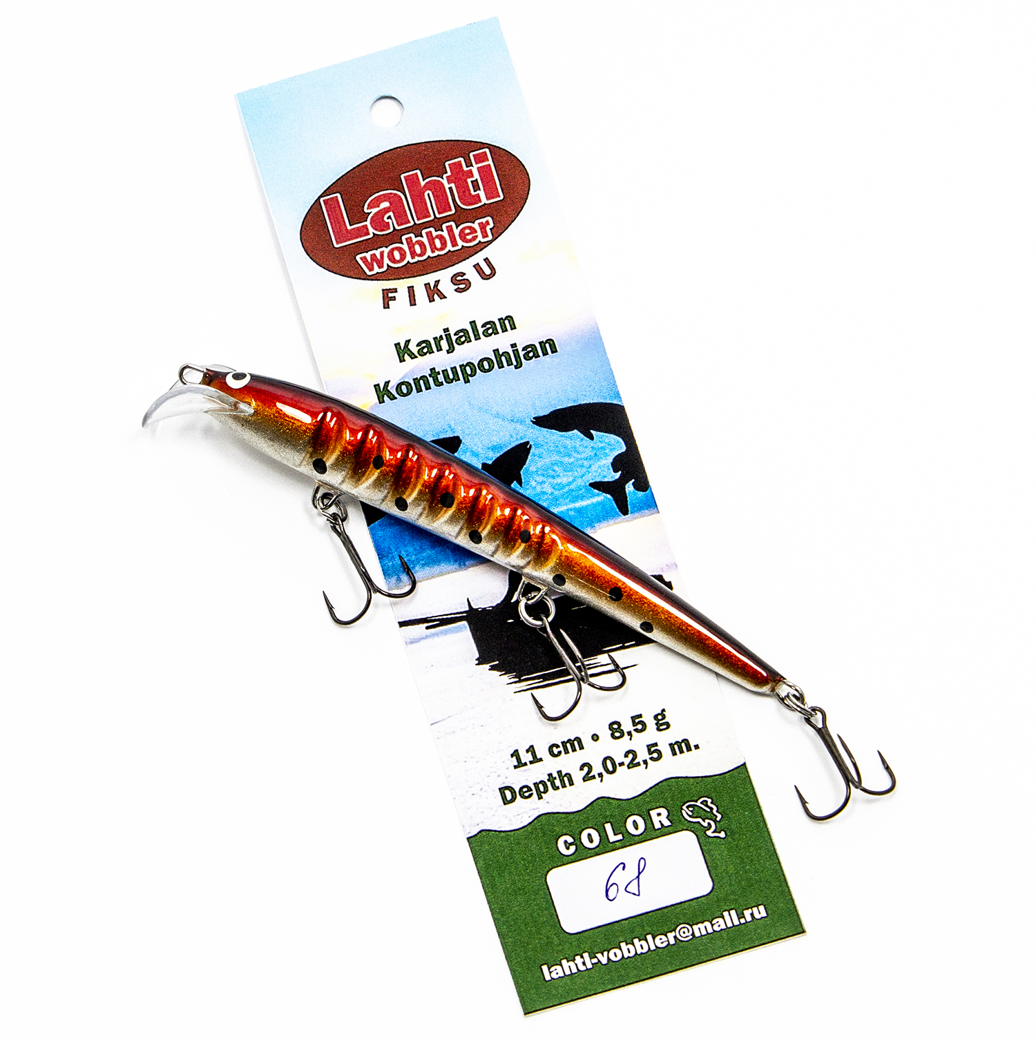Воблер Lahti Fiksu - новая модель от производителя из карельского города Кондопога. Когда-то в этом городе хорошо освоили процесс литья корпуса воблера из пенополиуретана (в просторечии ППУ), что позволило существенно снизить стоимость воблера, увеличить объёмы ручного производства и повысить прочность приманок. Первопроходцами были Jarvi, потом появились и другие производители, в том числе Lahti. Ярви и Лахти иногда путают, потому что воблеры очень похожи и сделаны по одной технологии (и даже карта расцветок почти совпадает), но это чуть-чуть разные воблеры. Ловят, однако, и те, и те.