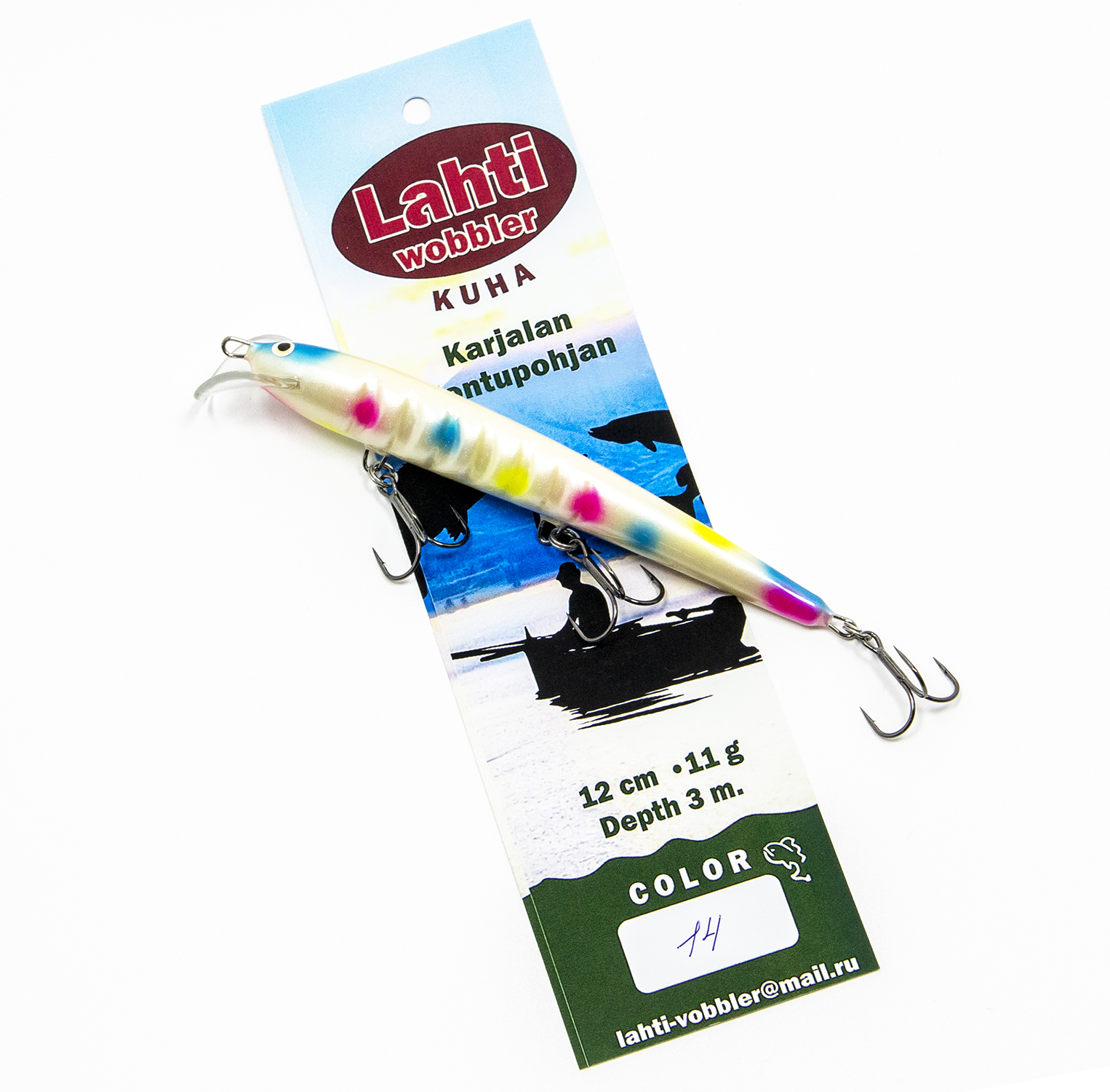 ТТХ Lahti Kuha: длина 12 см., вес: 11 гр., заглубление до 3 метров.