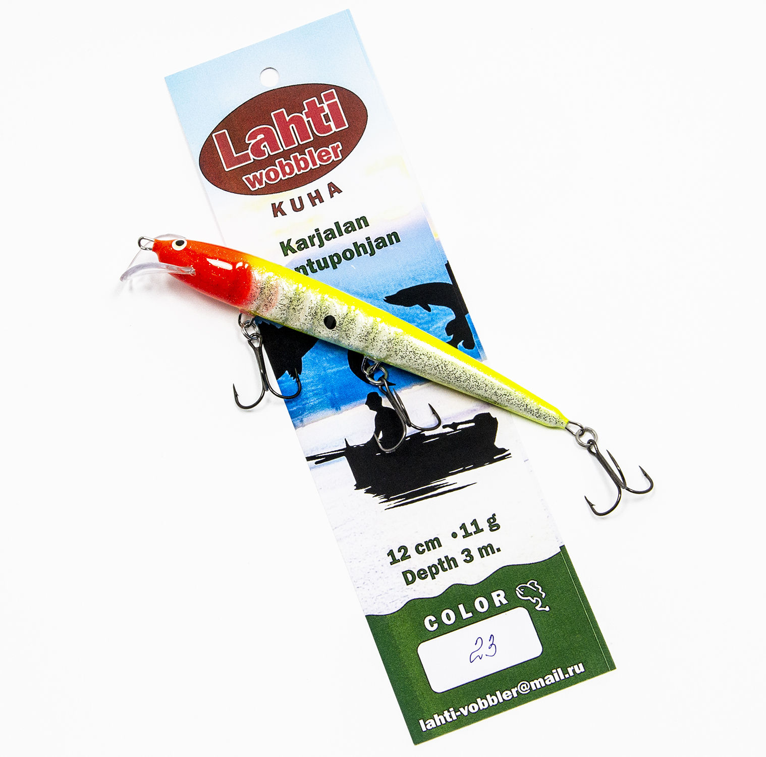 Воблер Lahti Kuha - хорошо зарекомендовавшая себя модель от производителя из карельского города Кондопога. Когда-то в этом городе хорошо освоили процесс литья корпуса воблера из пенополиуретана (в просторечии ППУ), что позволило существенно снизить стоимость воблера, увеличить объёмы ручного производства и повысить прочность приманок. Первопроходцами были Jarvi, потом появились и другие производители, в том числе Lahti. Ярви и Лахти иногда путают, потому что воблеры очень похожи и сделаны по одной технологии (и даже карта расцветок почти совпадает), но это чуть-чуть разные воблеры. Ловят, однако, и те, и те.