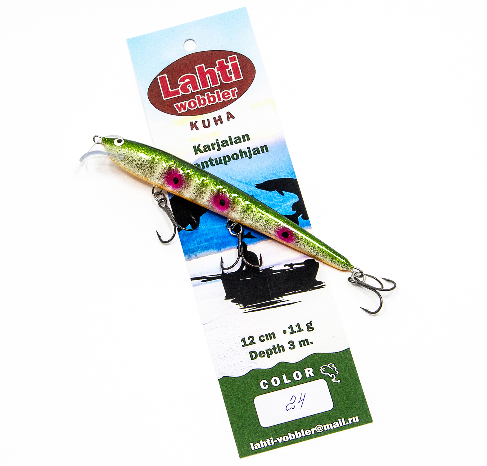Воблер Lahti Kuha - хорошо зарекомендовавшая себя модель от производителя из карельского города Кондопога. Когда-то в этом городе хорошо освоили процесс литья корпуса воблера из пенополиуретана (в просторечии ППУ), что позволило существенно снизить стоимость воблера, увеличить объёмы ручного производства и повысить прочность приманок. Первопроходцами были Jarvi, потом появились и другие производители, в том числе Lahti. Ярви и Лахти иногда путают, потому что воблеры очень похожи и сделаны по одной технологии (и даже карта расцветок почти совпадает), но это чуть-чуть разные воблеры. Ловят, однако, и те, и те.