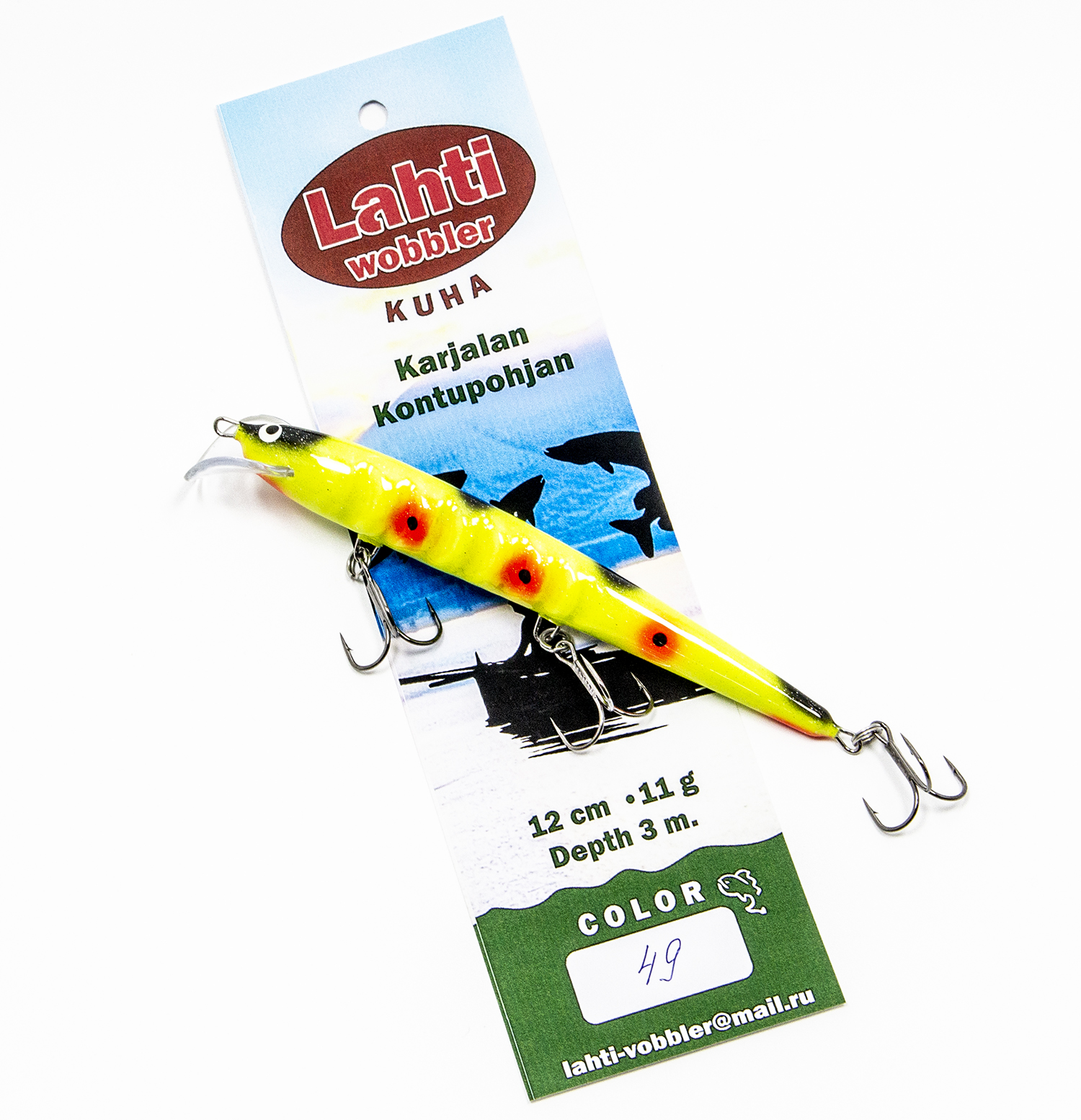 ТТХ Lahti Kuha: длина 12 см., вес: 11 гр., заглубление до 3 метров.