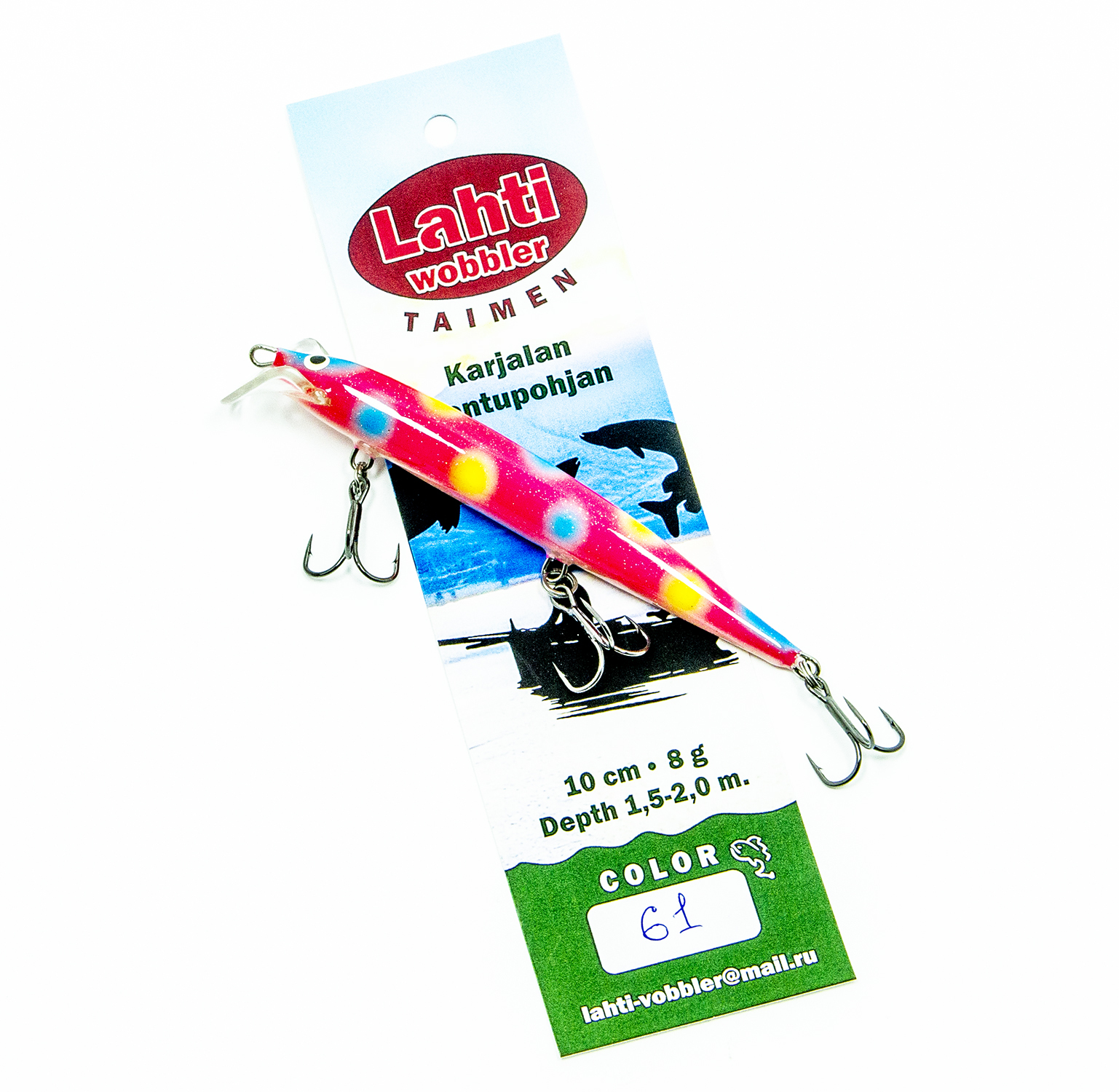 ТТХ Lahti Taimen: длина 10 см., вес: 8 гр., заглубление 1.5 - 2 метра.