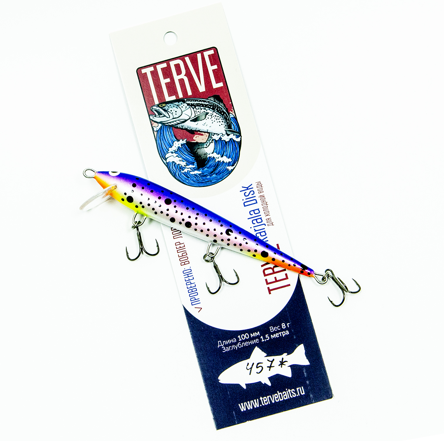 Внешний вид и игра воблера Terve Karjala Disk имитирует поведение ряпушки – основной кормовой базы лососевых в северных широтах. Лопатка в форме диска (или монетки) обеспечивает мелкочастотную игру без отскоков приманки вправо или влево от курса проводки (двойной игры у Terve Karjala Disk нет), но с очень выраженным троллингом (игрой по крену) – приманка как бы качает в воде боками, показывая попеременно то левый бок, то правый. Получается, что рыба постоянно видит какой-то контраст: то брюшко, то бок, снова брюшко и потом другой бок. Мы считаем, что именно это постоянное покачивание боками в сочетании с мелкочастотной деликатной игрой и провоцирует рыбу на атаку.