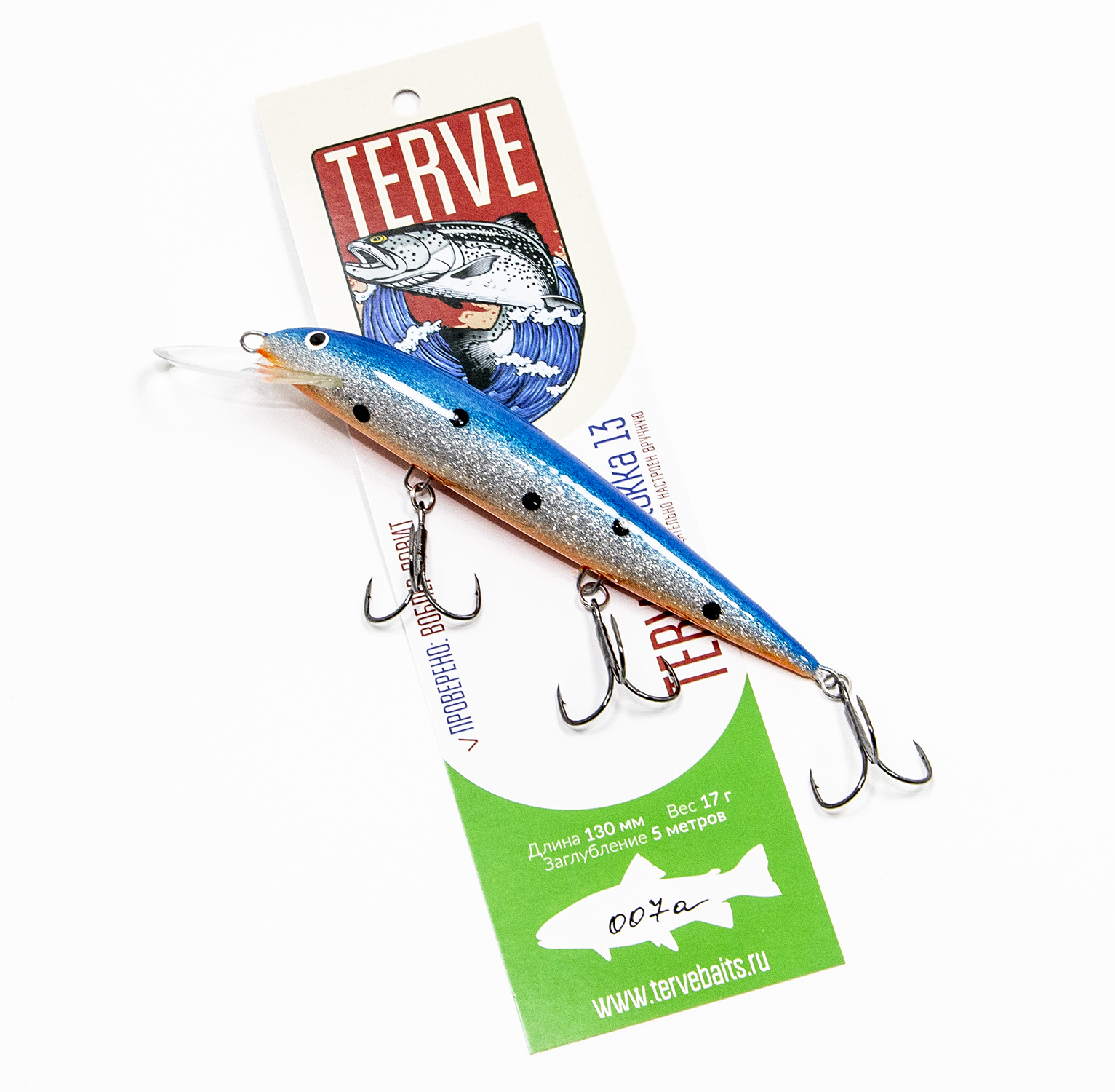 Воблер Terve Laatokka 13 см. работает и на троллинге, и взаброс. Ловит судака, щуку, окуня, кумжу, лосося и палию.