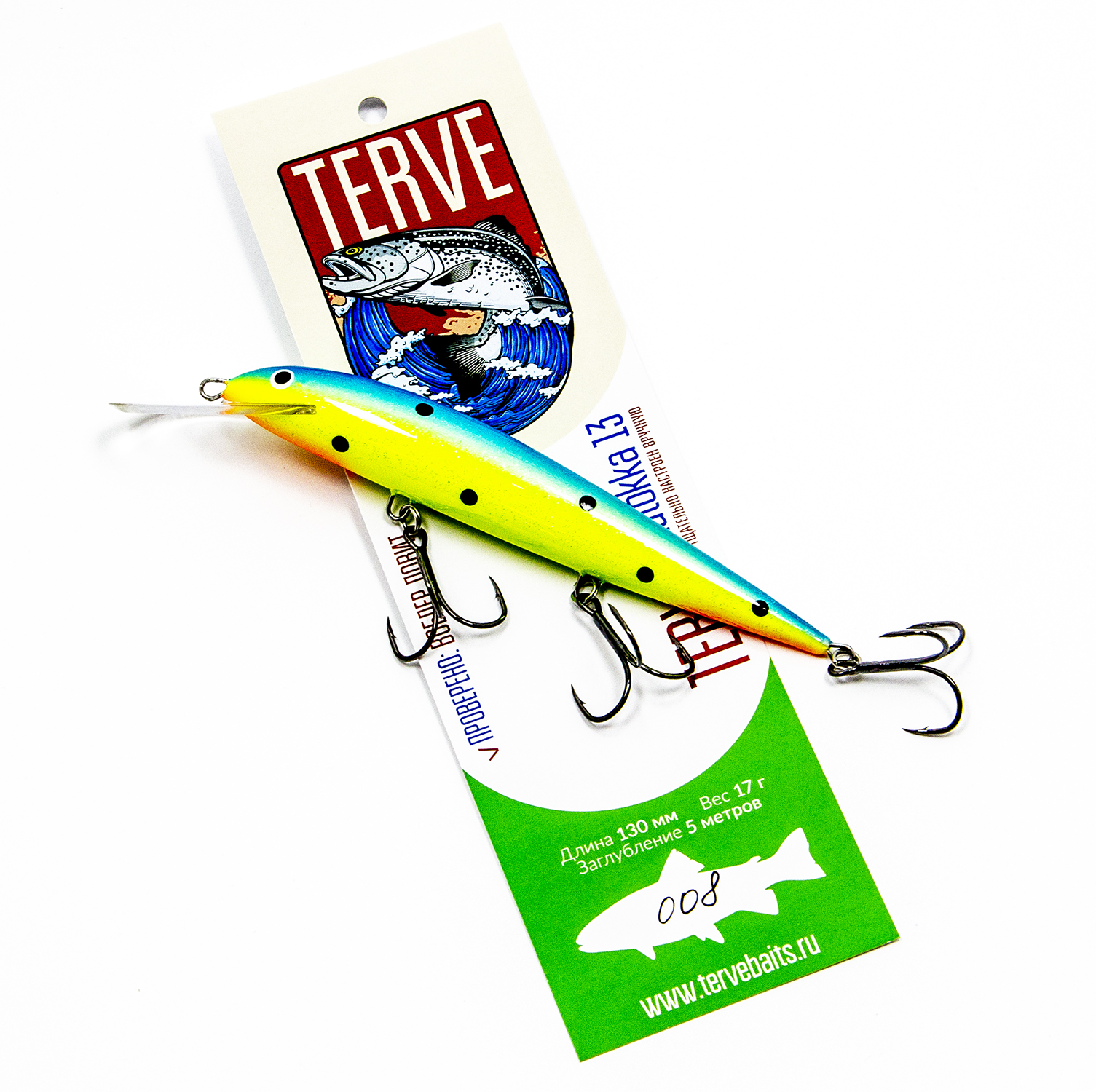 Воблер Terve Laatokka 13 см. работает и на троллинге, и взаброс. Ловит судака, щуку, окуня, кумжу, лосося и палию.
