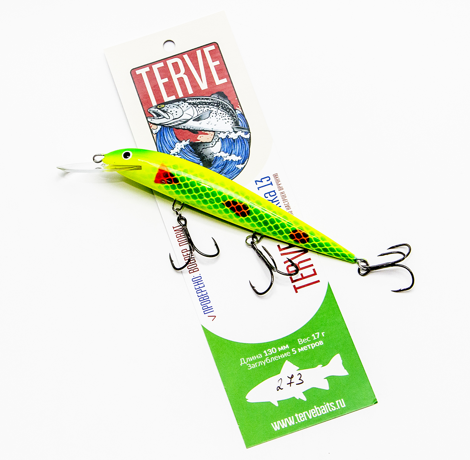 ТТХ воблера: вес 17 гр., длина 13 см., заглубление заявленное производителем – 5 метров. Воблер плавающий, "тихий" (без шумовой камеры).