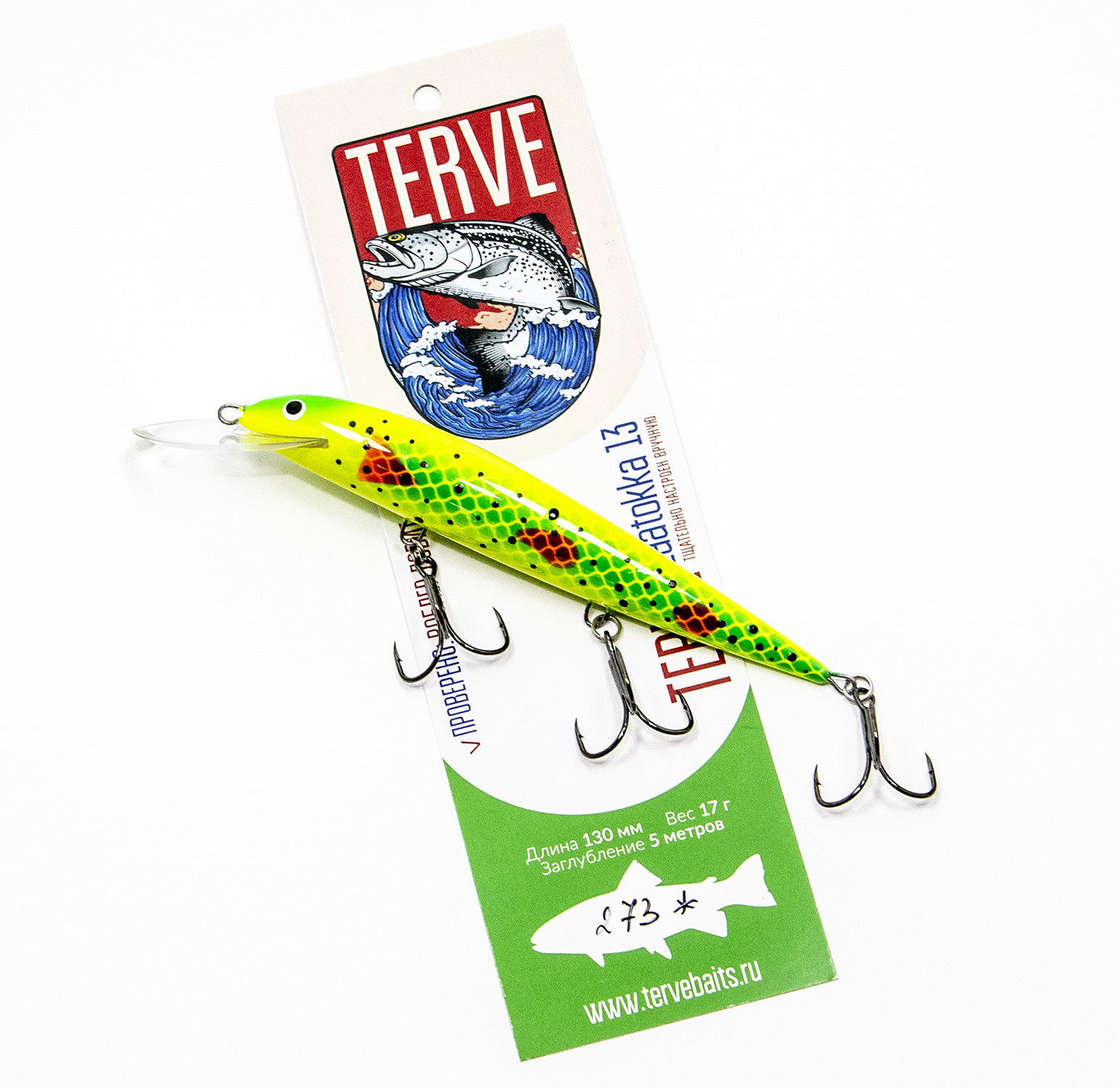 Воблер Terve Laatokka 13 см. – это удачная реплика очень известного и уловистого финского воблера Jarmo Karikko 13 см, одного из самых рабочих и популярных воблеров в мире! Эта приманка была разработана специально для троллинга судака и лососевых рыб, но не менее хорошо она справляется и с ловлей щуки.