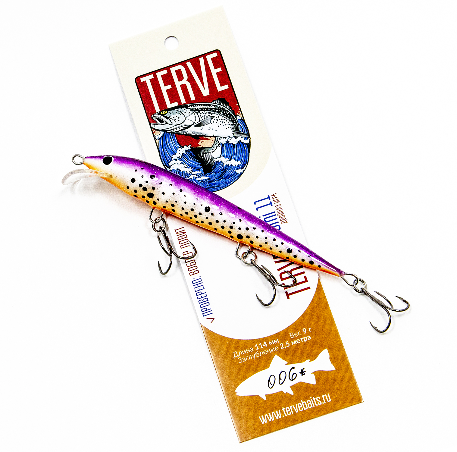 ТТХ воблера: длина 114 мм., вес 9 гр., воблер плавающий, заглубление 2-2,5 метра в зависимости от скорости проводки, толщины лески и дальности отпуска.