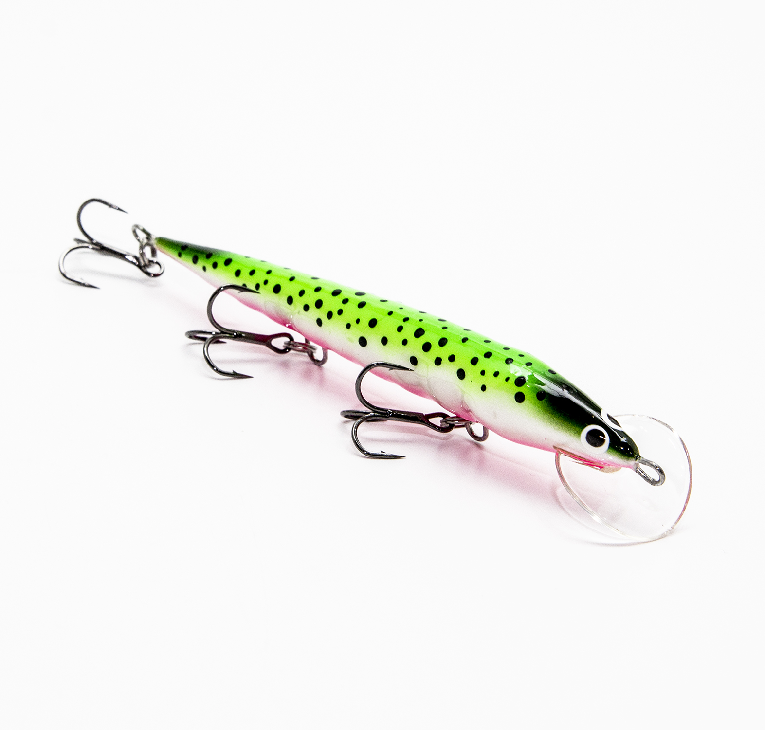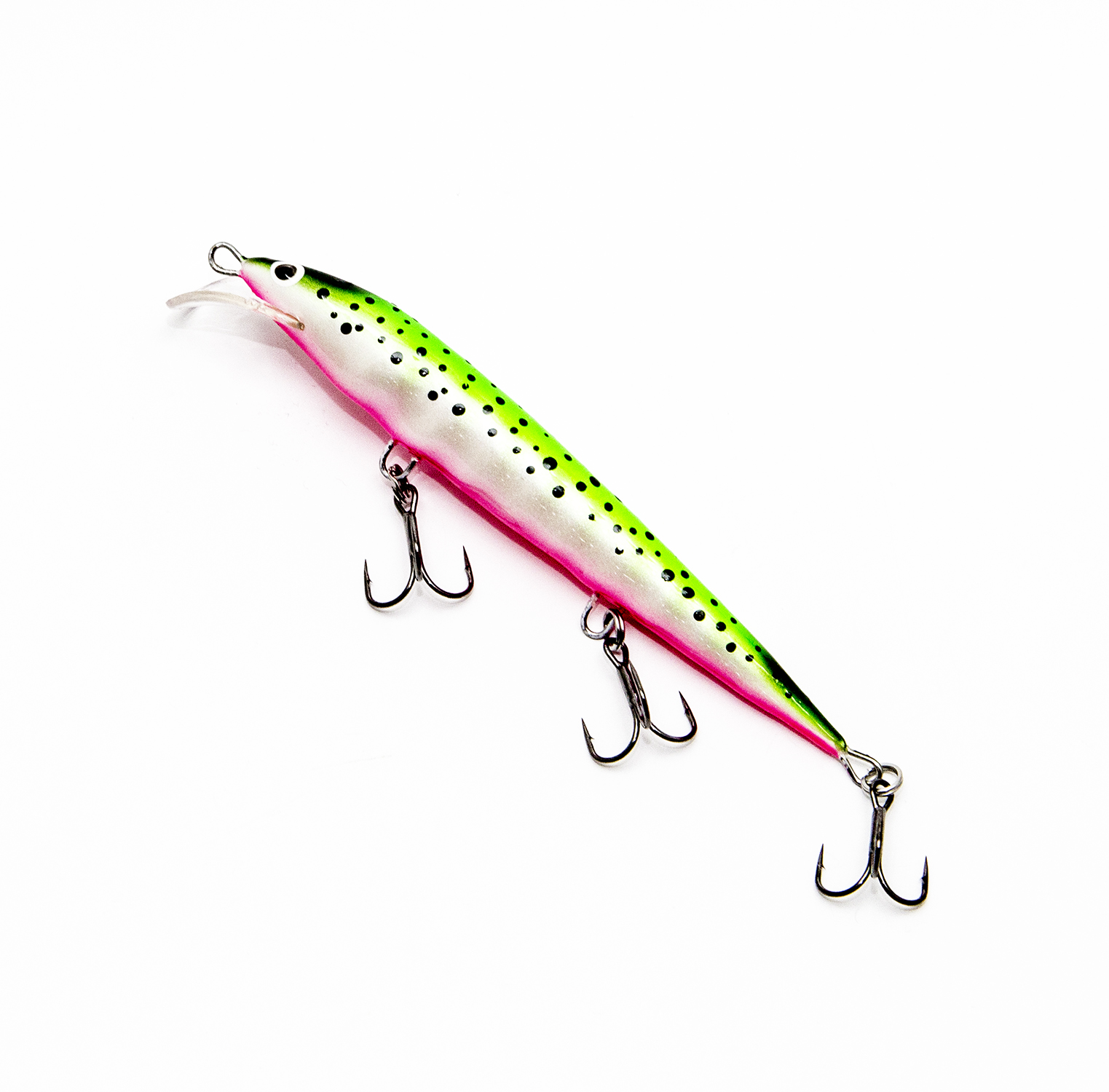 Модель имеет очень много вариантов расцветок с упором на лососевых и судака, однако есть и натуральные расцветки. Воблер оснащён хорошей надёжной фурнитурой, ни крючки, ни кольца менять вам не придётся.