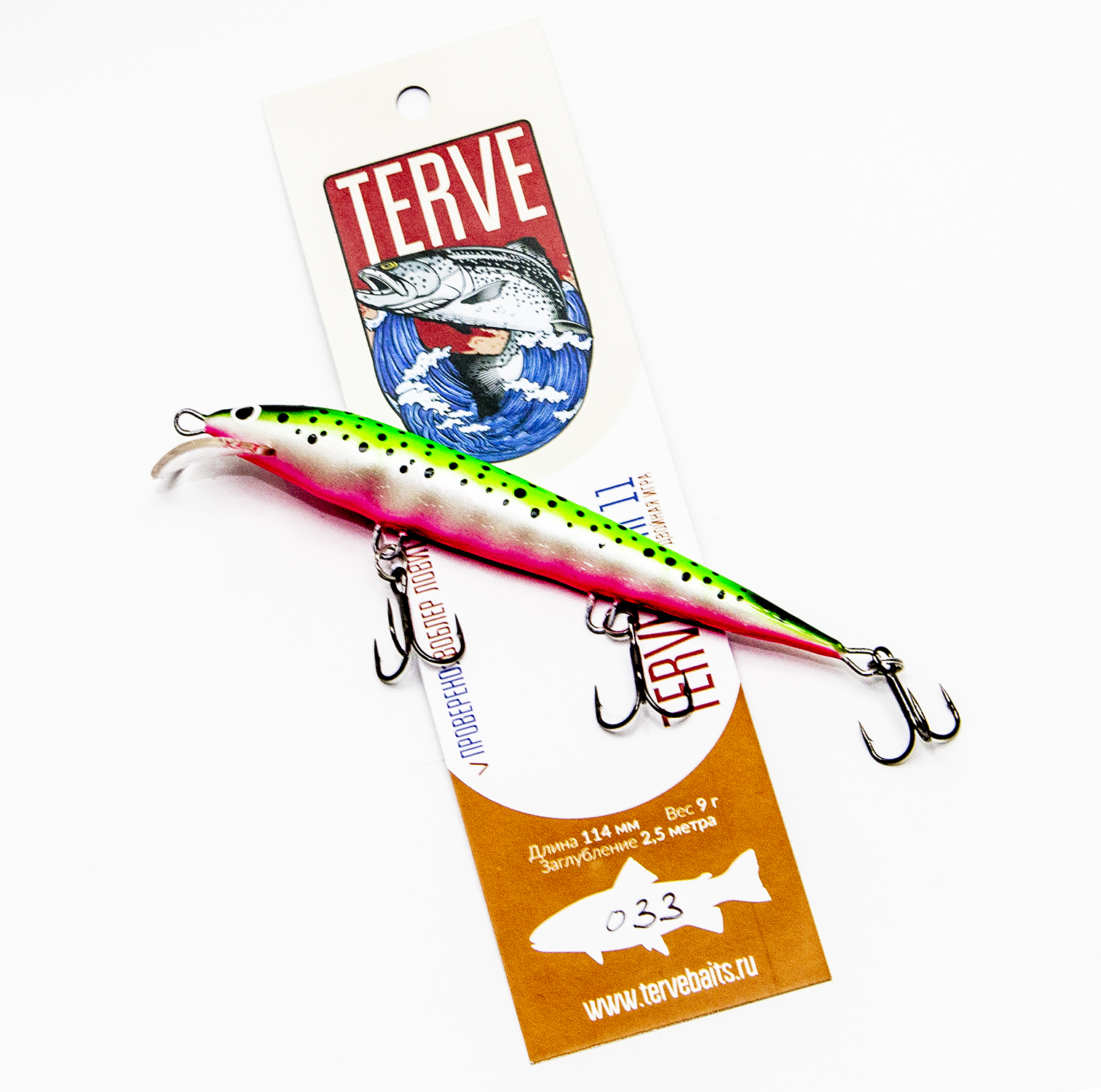 ТТХ воблера: длина 114 мм., вес 9 гр., воблер плавающий, заглубление 2-2,5 метра в зависимости от скорости проводки, толщины лески и дальности отпуска.