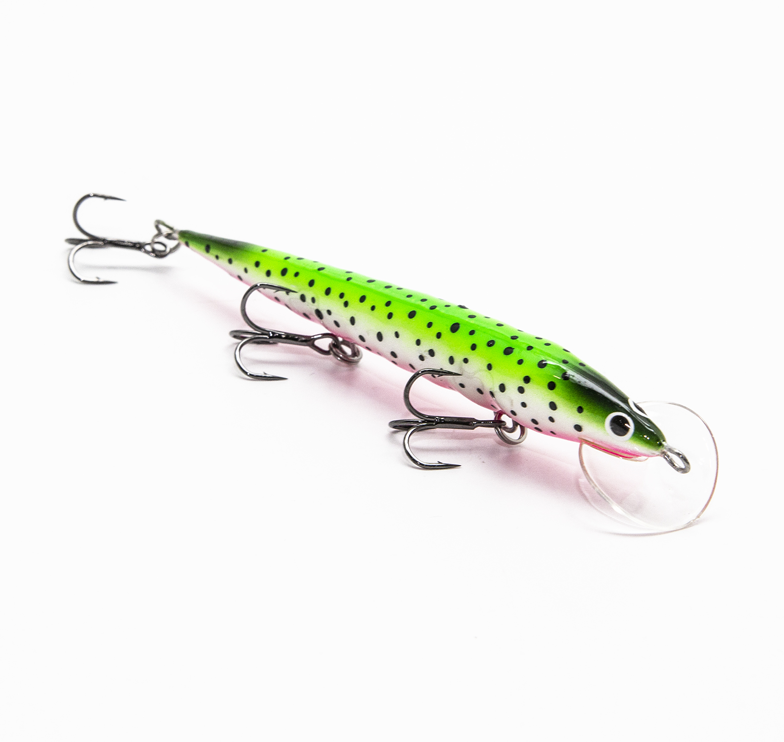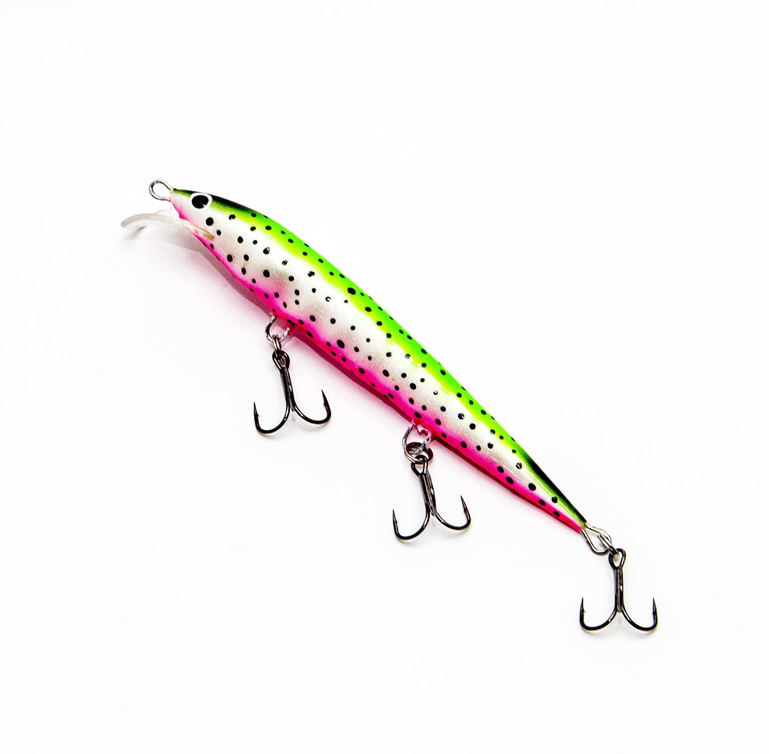 Модель имеет очень много вариантов расцветок с упором на лососевых и судака, однако есть и натуральные расцветки. Воблер оснащён хорошей надёжной фурнитурой, ни крючки, ни кольца менять вам не придётся.