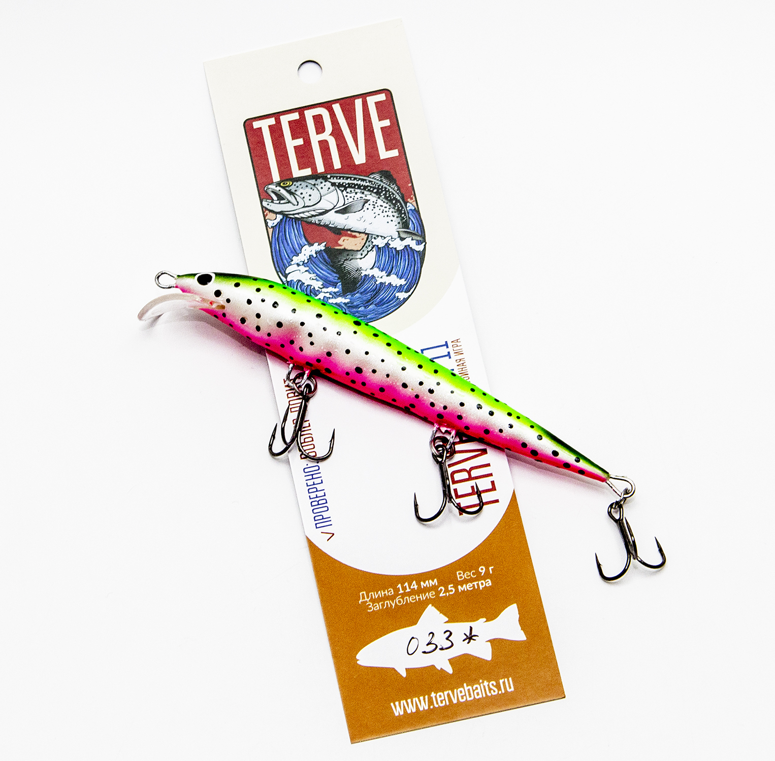 ТТХ воблера: длина 114 мм., вес 9 гр., воблер плавающий, заглубление 2-2,5 метра в зависимости от скорости проводки, толщины лески и дальности отпуска.