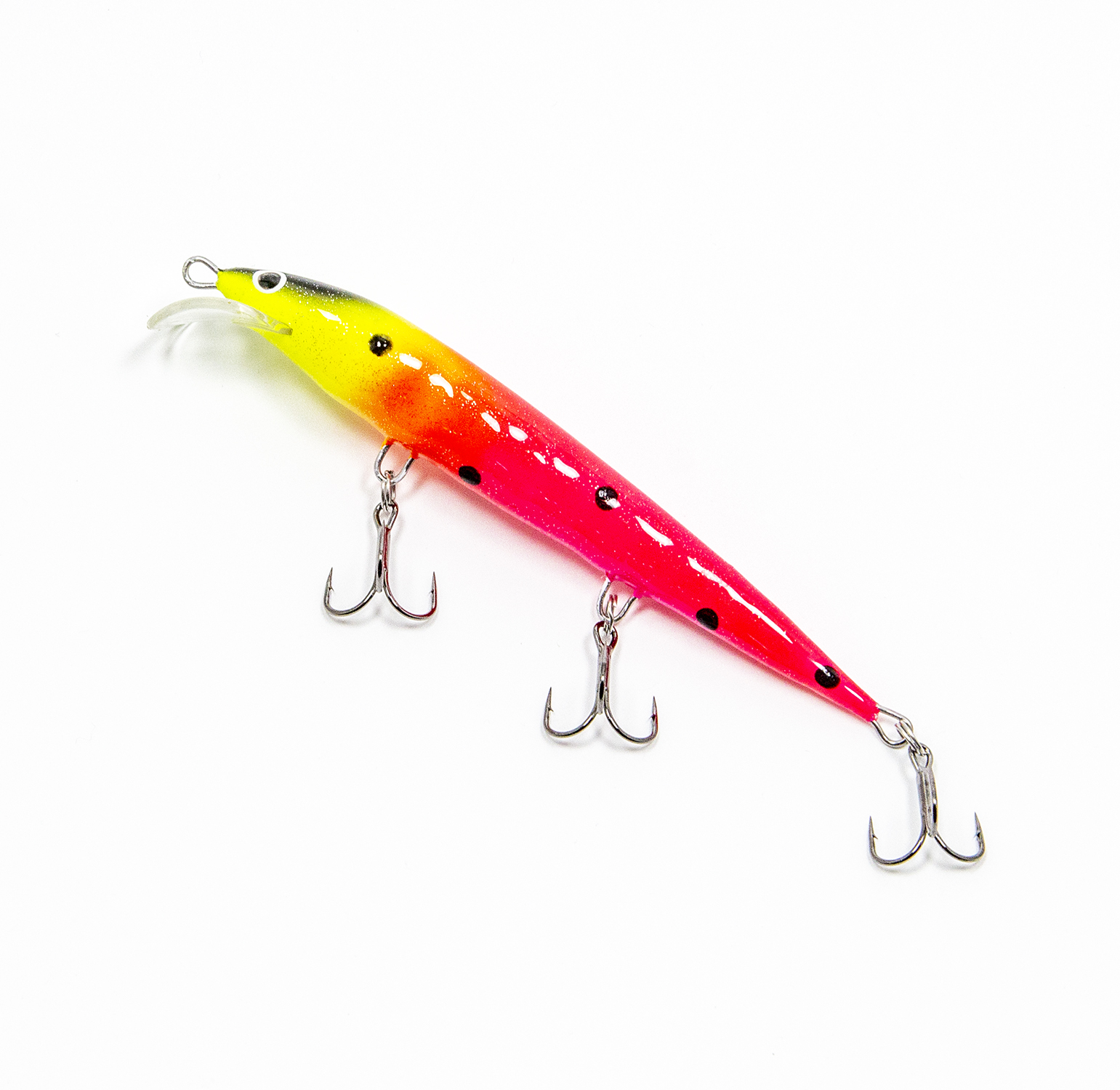 Модель имеет очень много вариантов расцветок с упором на лососевых и судака, однако есть и натуральные расцветки. Воблер оснащён хорошей надёжной фурнитурой, ни крючки, ни кольца менять вам не придётся.