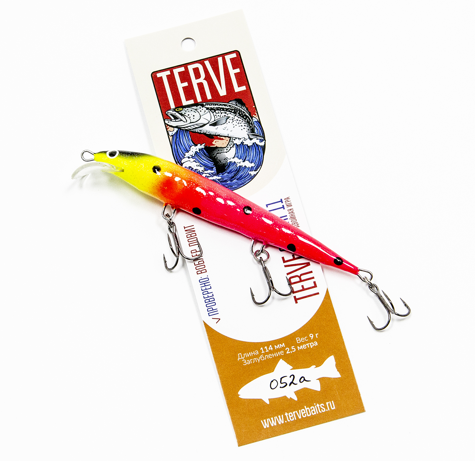 ТТХ воблера: длина 114 мм., вес 9 гр., воблер плавающий, заглубление 2-2,5 метра в зависимости от скорости проводки, толщины лески и дальности отпуска.