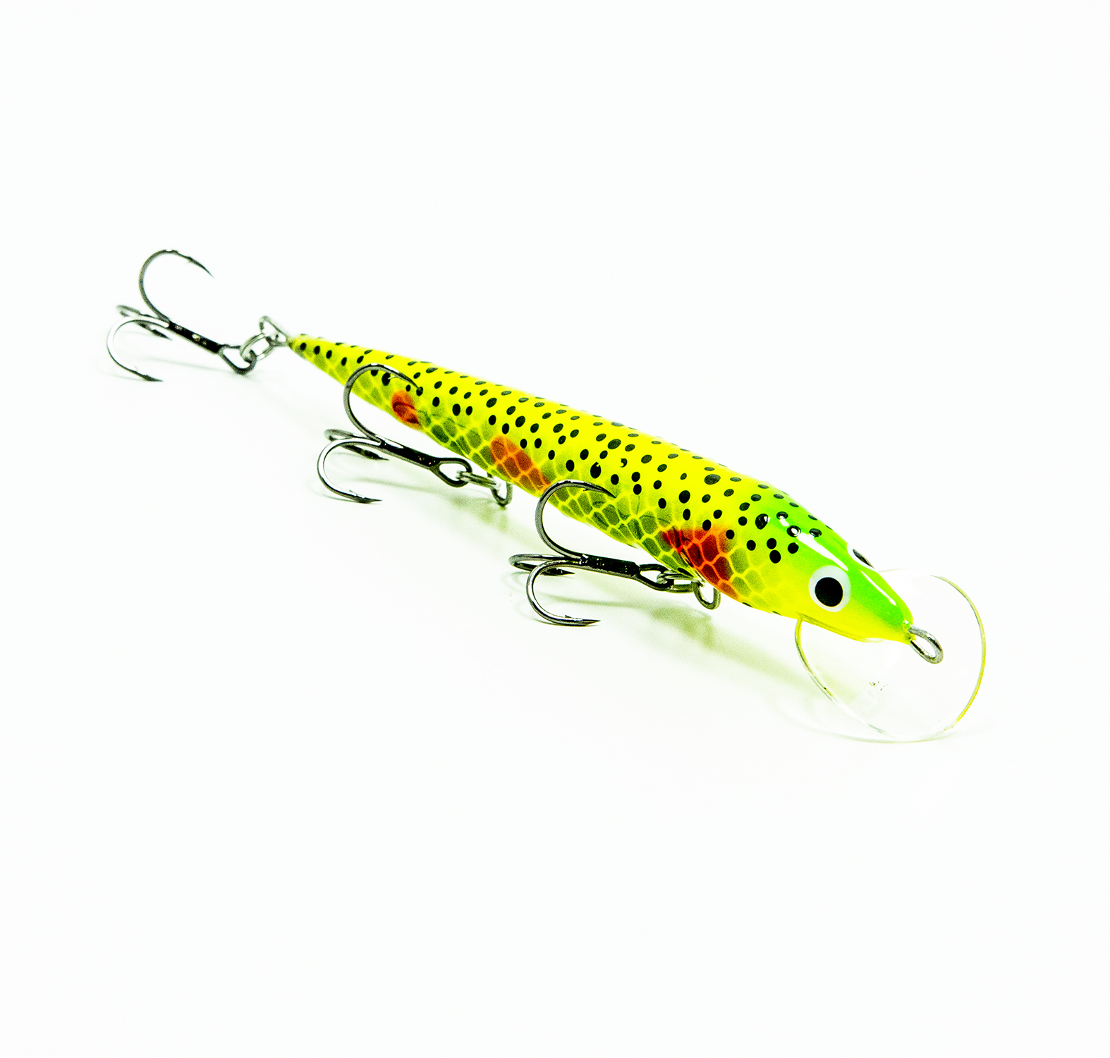 Воблер Terve Suomi - это классический троллинговый минноу с седловидной лопаткой. Тем не менее, конструктивно он сделан не совсем обычно – корпус воблера ребристый, что при проводке создаёт дополнительные завихрения воды, привлекающие хищника. Мы не знаем точно в чём секрет этой приманки, но Terve Suomi прекрасно ловит на равномерной проводке без какой-либо дополнительной анимации и показал отличные результаты при ловле судака, щуки и лосося.