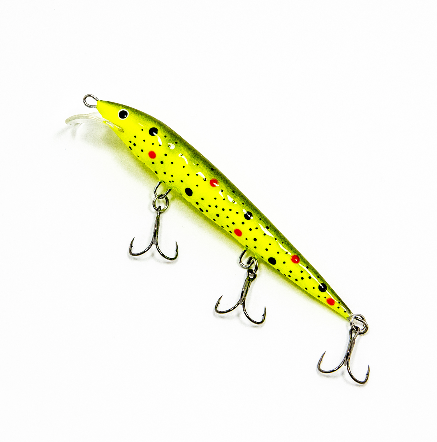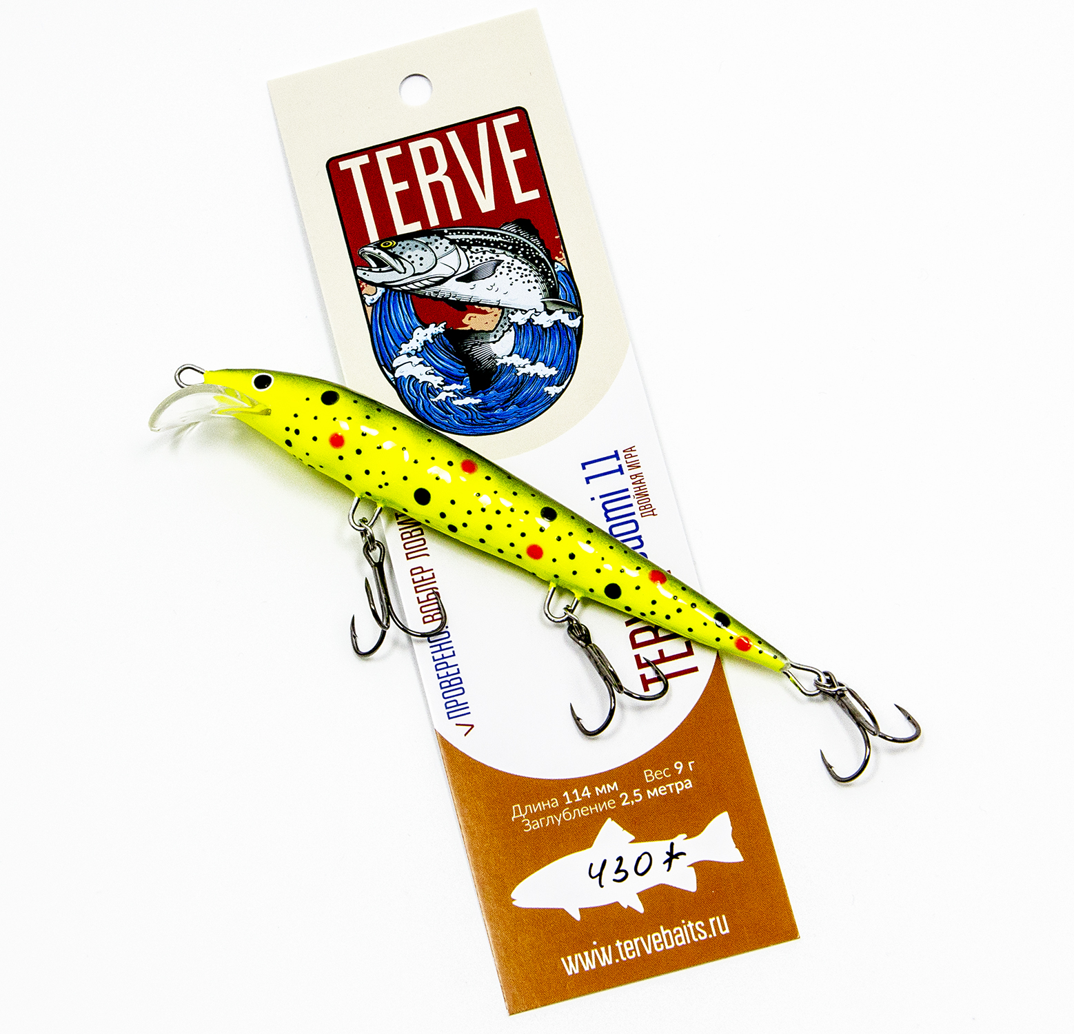 Воблер Terve Suomi - это классический троллинговый минноу с седловидной лопаткой. Тем не менее, конструктивно он сделан не совсем обычно – корпус воблера ребристый, что при проводке создаёт дополнительные завихрения воды, привлекающие хищника. Мы не знаем точно в чём секрет этой приманки, но Terve Suomi прекрасно ловит на равномерной проводке без какой-либо дополнительной анимации и показал отличные результаты при ловле судака, щуки и лосося.