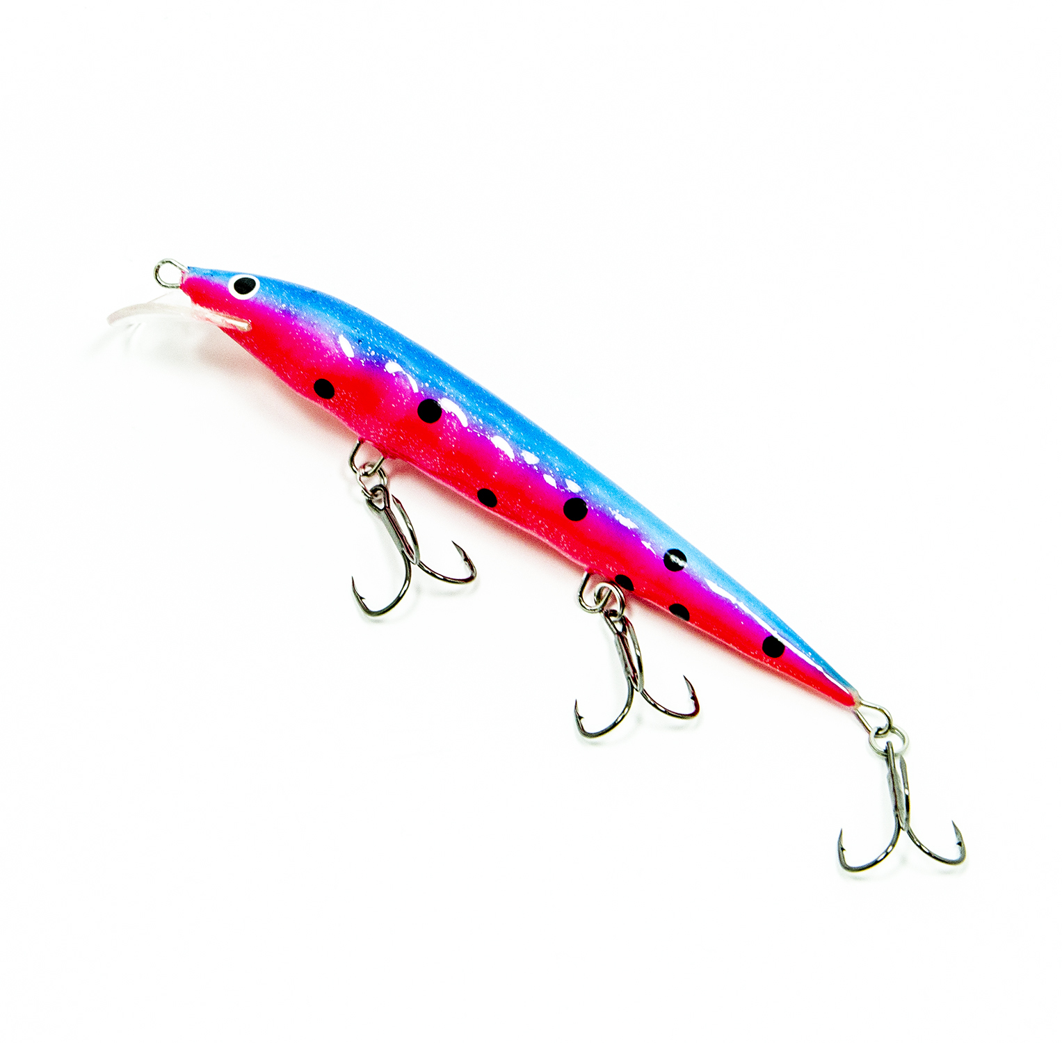 Модель имеет очень много вариантов расцветок с упором на лососевых и судака, однако есть и натуральные расцветки. Воблер оснащён хорошей надёжной фурнитурой, ни крючки, ни кольца менять вам не придётся.