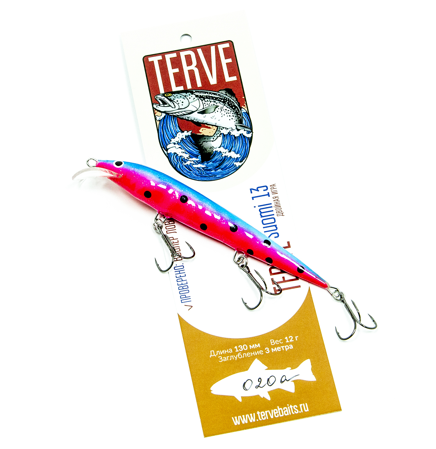 Воблер Terve Suomi - это классический троллинговый минноу с седловидной лопаткой. Тем не менее, конструктивно он сделан не совсем обычно – корпус воблера ребристый, что при проводке создаёт дополнительные завихрения воды, привлекающие хищника. Мы не знаем точно в чём секрет этой приманки, но Terve Suomi прекрасно ловит на равномерной проводке без какой-либо дополнительной анимации и показал отличные результаты при ловле судака, щуки и лосося.