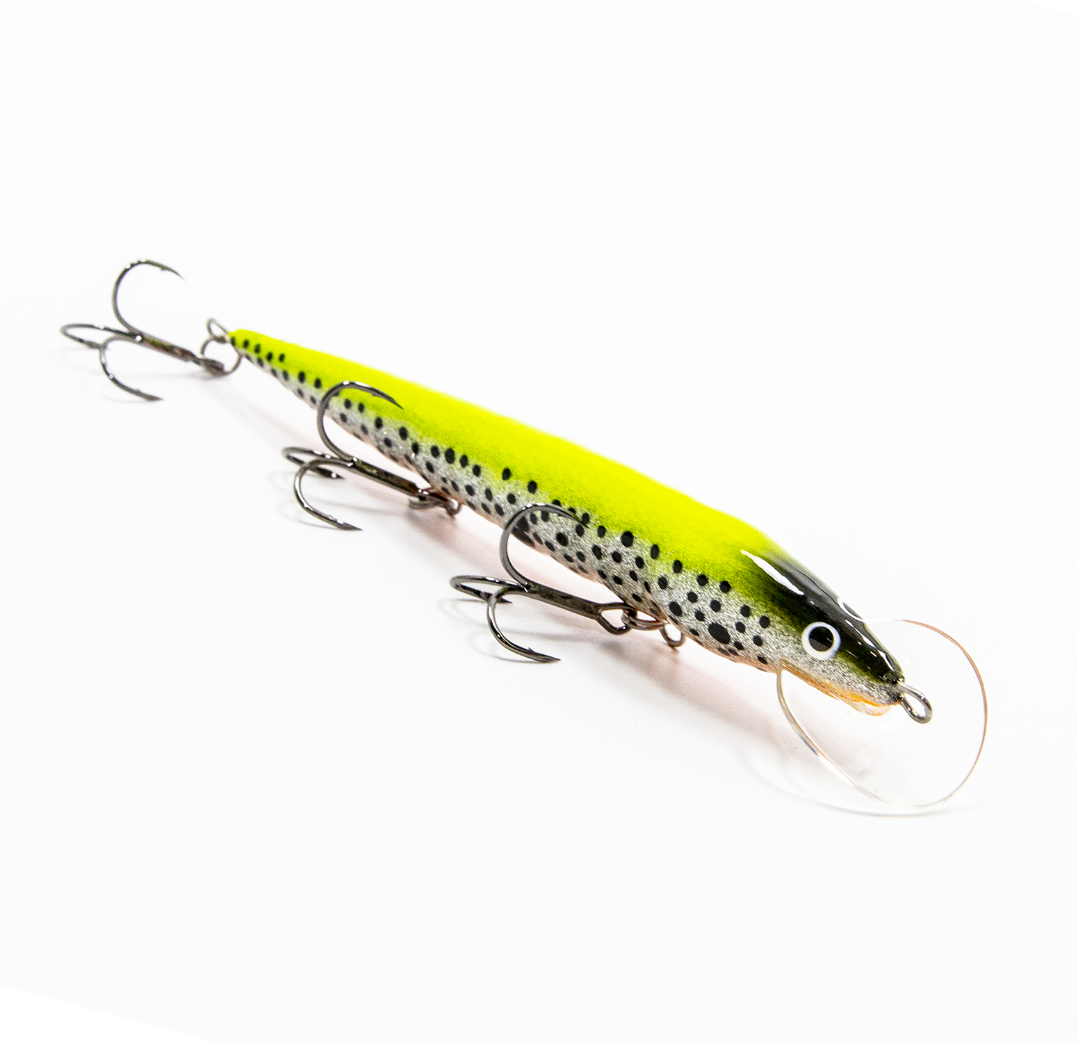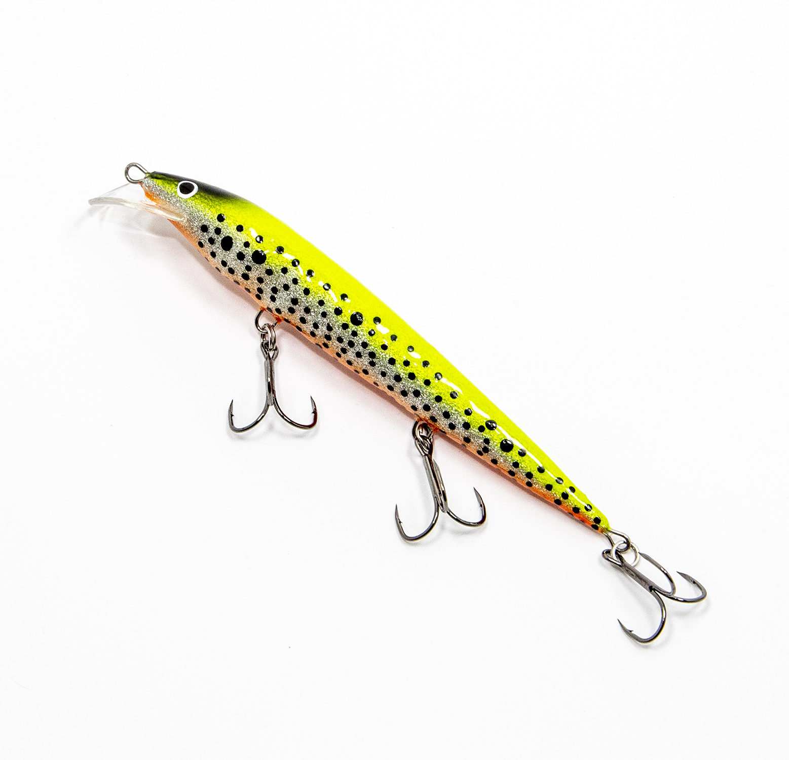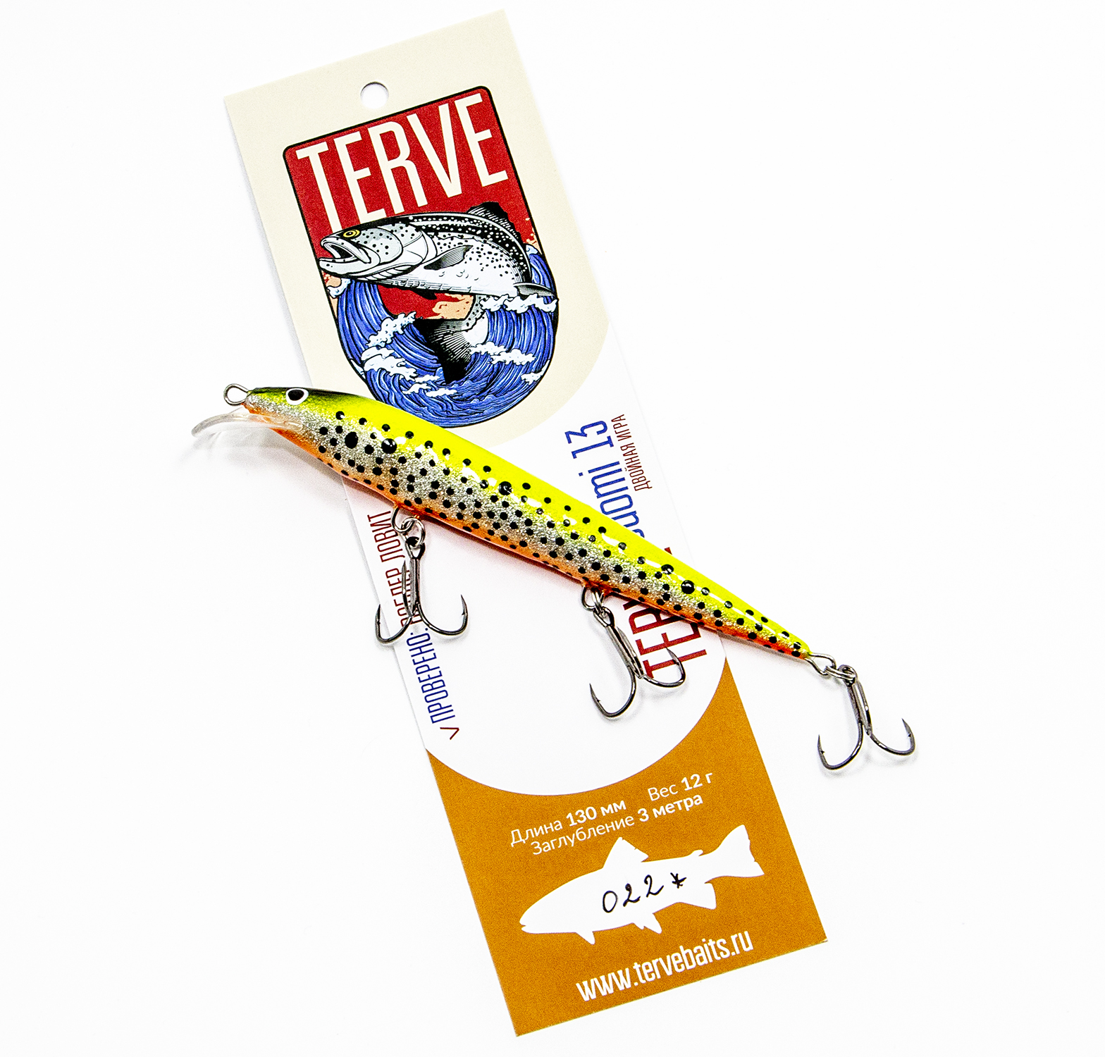 Воблер Terve Suomi - это классический троллинговый минноу с седловидной лопаткой. Тем не менее, конструктивно он сделан не совсем обычно – корпус воблера ребристый, что при проводке создаёт дополнительные завихрения воды, привлекающие хищника. Мы не знаем точно в чём секрет этой приманки, но Terve Suomi прекрасно ловит на равномерной проводке без какой-либо дополнительной анимации и показал отличные результаты при ловле судака, щуки и лосося.