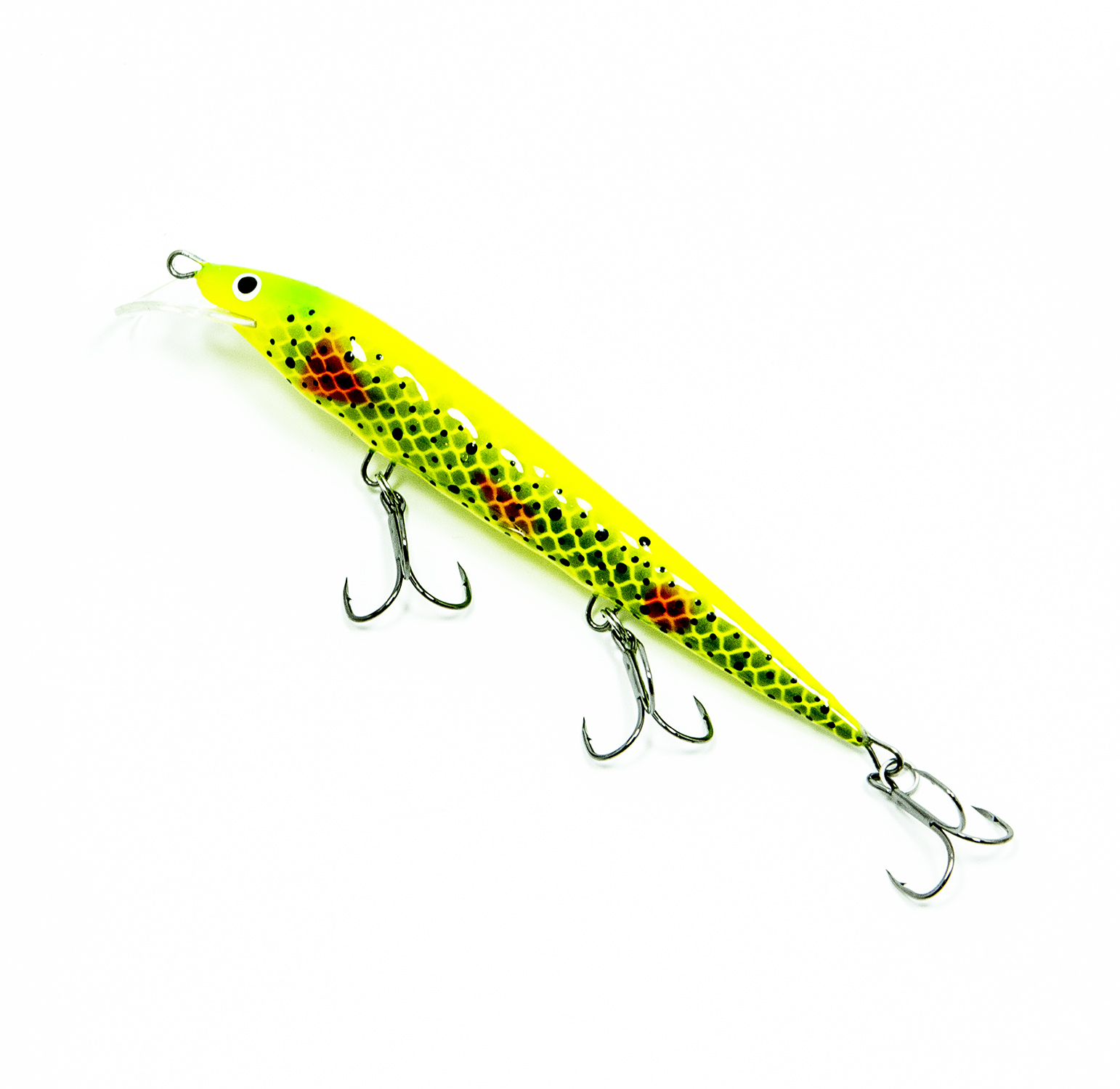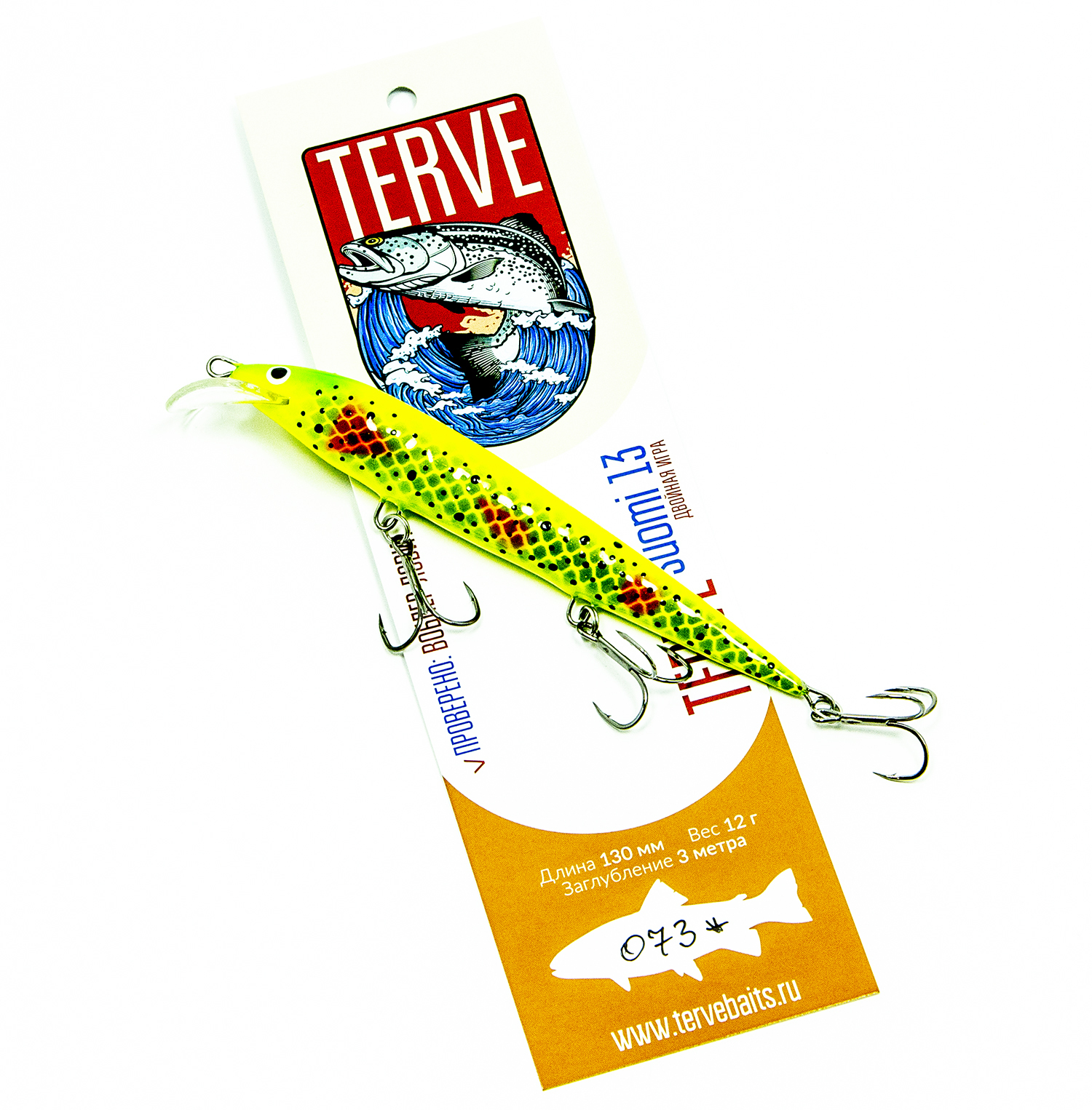 Воблер Terve Suomi - это классический троллинговый минноу с седловидной лопаткой. Тем не менее, конструктивно он сделан не совсем обычно – корпус воблера ребристый, что при проводке создаёт дополнительные завихрения воды, привлекающие хищника. Мы не знаем точно в чём секрет этой приманки, но Terve Suomi прекрасно ловит на равномерной проводке без какой-либо дополнительной анимации и показал отличные результаты при ловле судака, щуки и лосося.