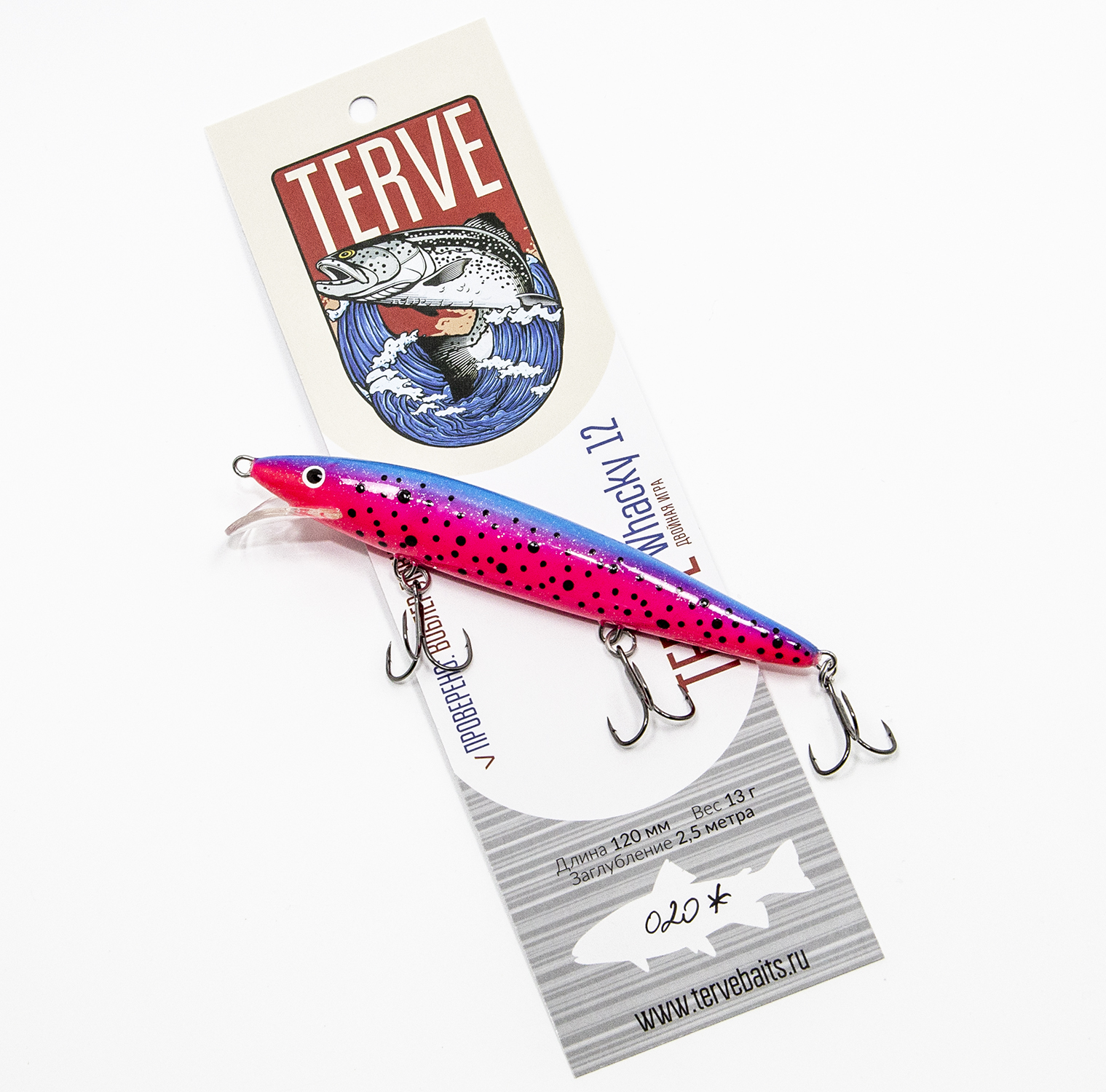В ходе практических испытаний была установлена высокая стабильность работы Terve Whacky на протяжении всего сезона открытой воды. Об универсальности этой приманки много говорит то, что воблер ещё на этапе предсерийных испытаний отлично ловил совершенно разных хищников на очень разных и отдалённых друг от друга водоёмах - щуку, судака, окуня, лосося, кумжу, палию. Очень быстро стало понятно, что Terve Whacky 12 срочно нужно запускать в серийное производство.