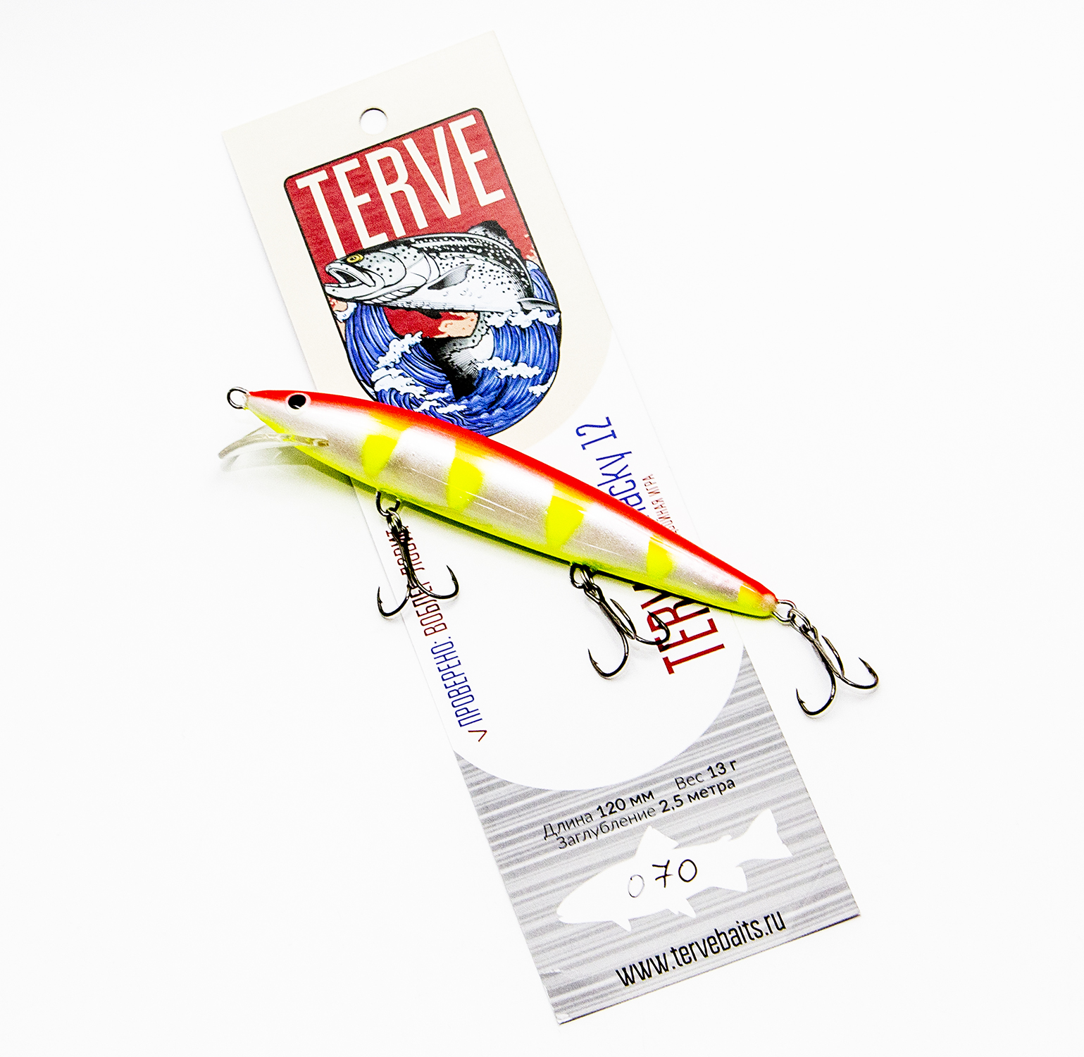 ТТХ воблера: длина 120 мм., вес – 13 грамм, заглубление 2,5 метра. Воблер плавающий.