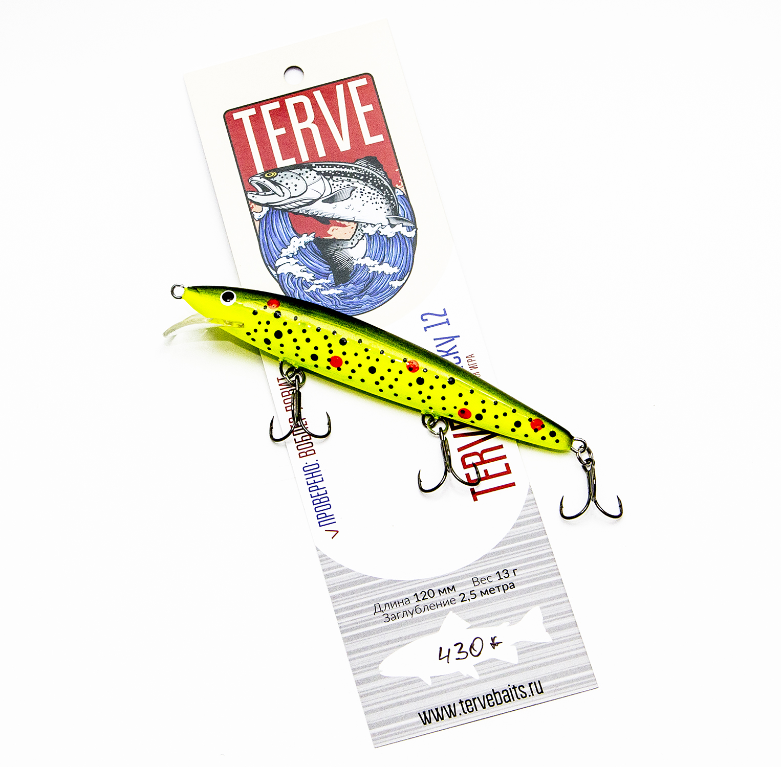 ТТХ воблера: длина 120 мм., вес – 13 грамм, заглубление 2,5 метра. Воблер плавающий.