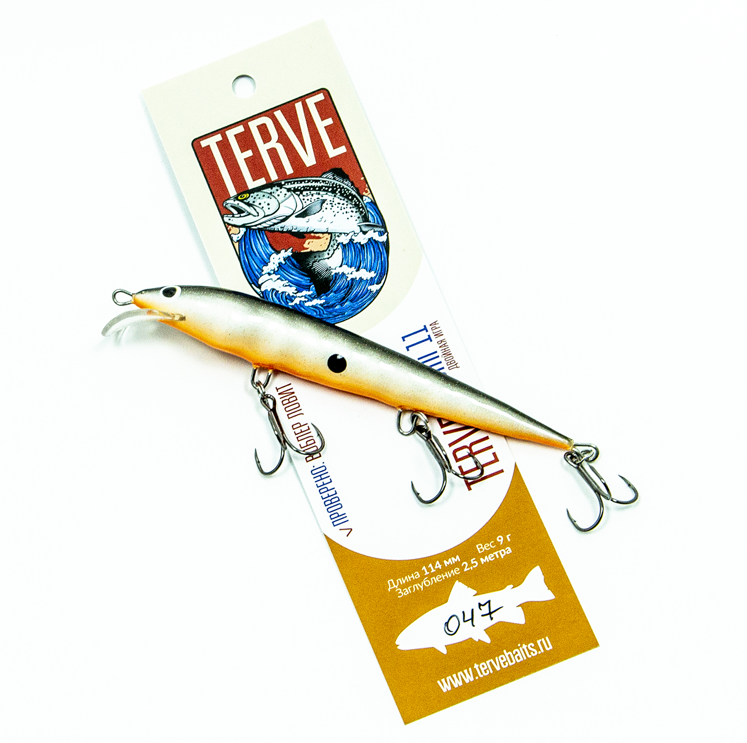 Воблер Terve Suomi - это классический троллинговый минноу с седловидной лопаткой. Тем не менее, конструктивно он сделан не совсем обычно – корпус воблера ребристый, что при проводке создаёт дополнительные завихрения воды, привлекающие хищника. Мы не знаем точно в чём секрет этой приманки, но Terve Suomi прекрасно ловит на равномерной проводке без какой-либо дополнительной анимации и показал отличные результаты при ловле судака, щуки и лосося.